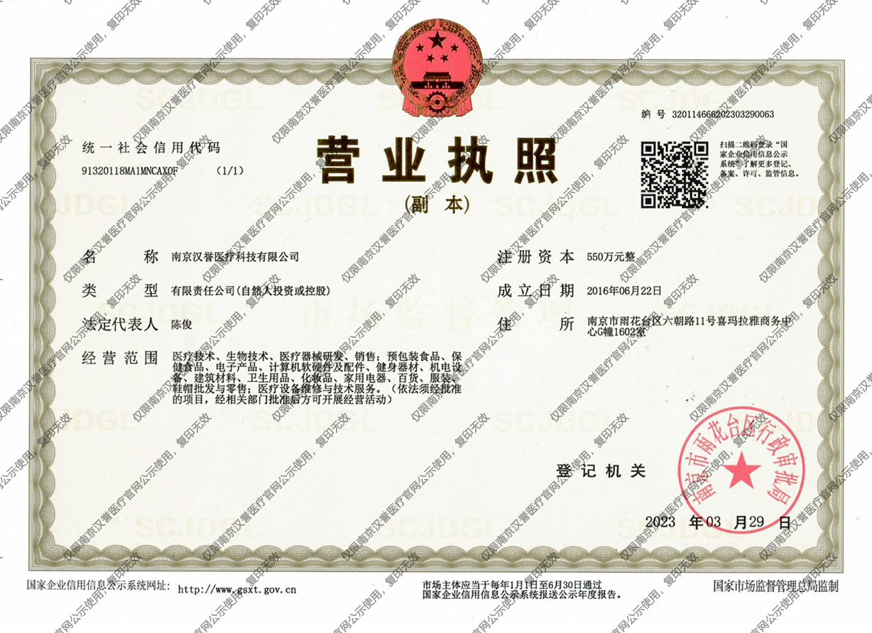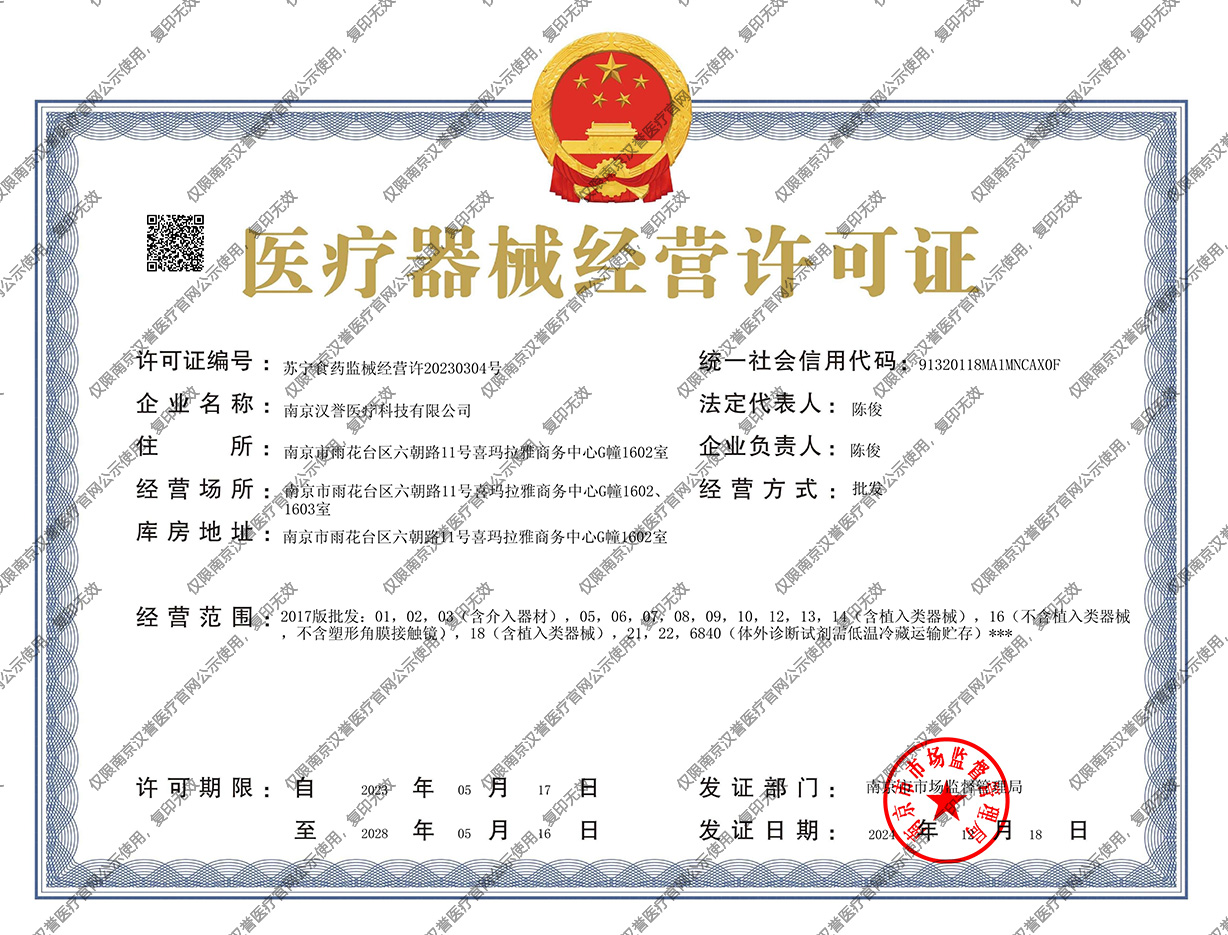 醫(yī)療器械經(jīng)營許可證:蘇寧食藥監(jiān)械經(jīng)營許20230304號