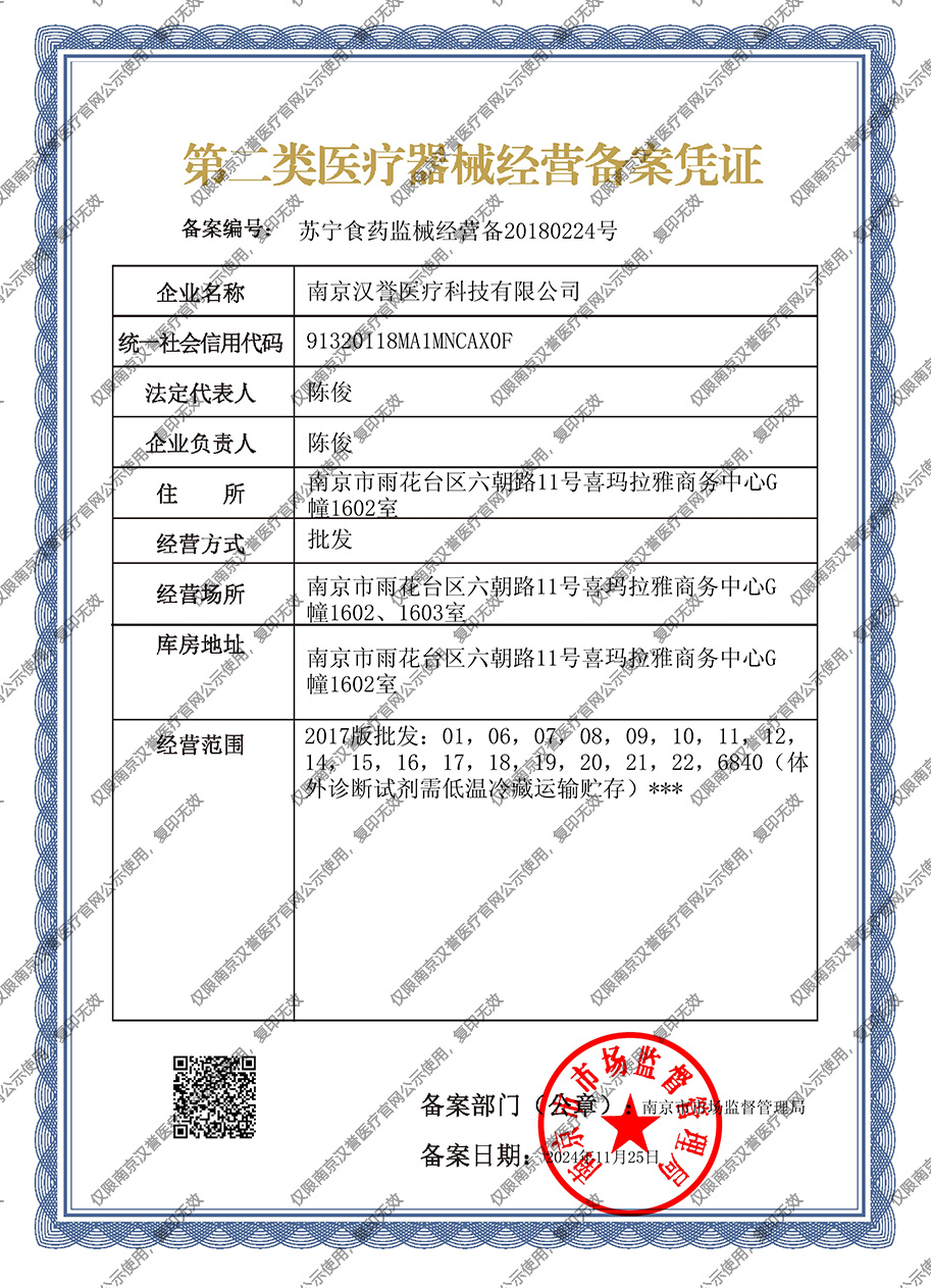 第二類醫(yī)療器械經(jīng)營備案憑證:蘇寧食藥監(jiān)械經(jīng)營備20180224號