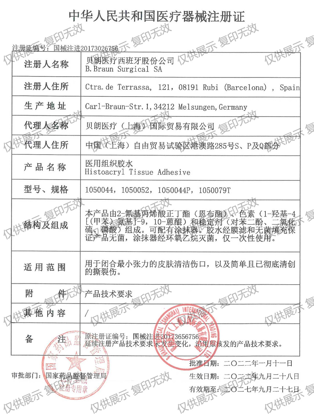 1.貝朗醫(yī)用組織膠水可能含有禁忌內(nèi)容或者注意事項,具體詳見說明書。